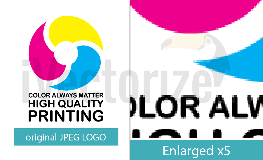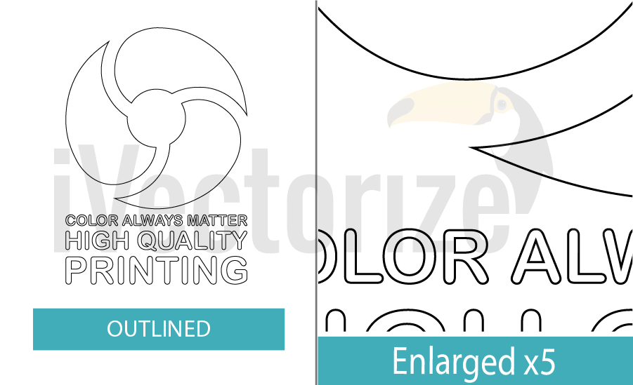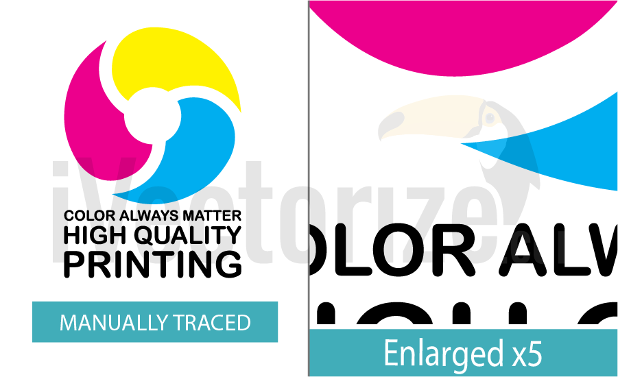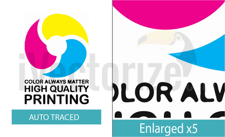 At first sight when you look at the left part of the vectorized logo you can think that it looks totally fine and that you can work with it and use it in your projects. If you cast a second look you will see that the letters of the motto “Color always matter high quality printing” is completely distorted and appears out of shape. What is the matter? Why does this happen? The answer is when auto tracing function is applied to vectorize an image, it works by recognizing pixels of the image and accordingly convert those pixels to vectors. Unfortunately, perhaps also for some businesses luckily, our advanced machinery and software programs cannot yet give such solutions for vectorizing logos and images with the skills a human would use to do. The machine lacks the artistic touch of a designer who can easily gives unique design solutions while converting raster logos to vectors. And it is worth to note that the autotraced logo in the image has pretty high resolution. We can confidently assume that the outcome of automatic tracing would be far worse if the image initially had lower resolution. Thus we see that the advantage of auto vectorization is fast timing. However it has a major disadvantage which is the final result product. Automatic vector tracing function can be good for images with grunge effect and no how for high detailed images where you need to have smooth curves.